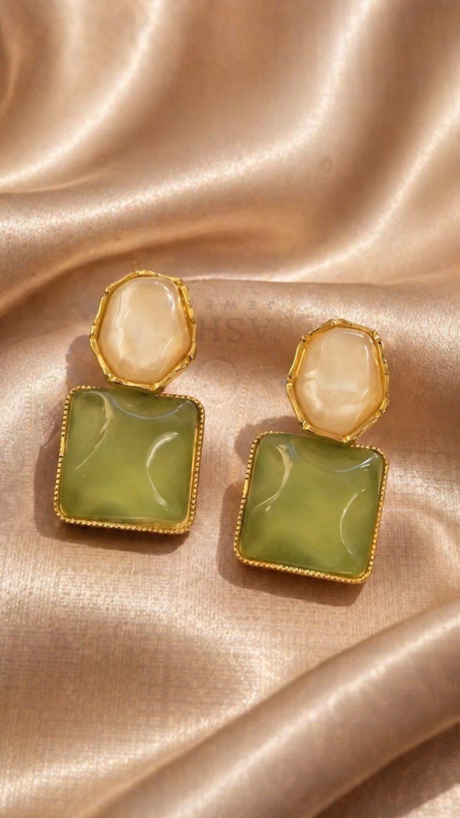 Elevate your style with these beautifully designed dual-tone drop earrings that blend elegance with a modern touch. Featuring a soft pearl-like top paired with a glossy olive-green square stone, this piece creates a unique and eye-catching contrast.