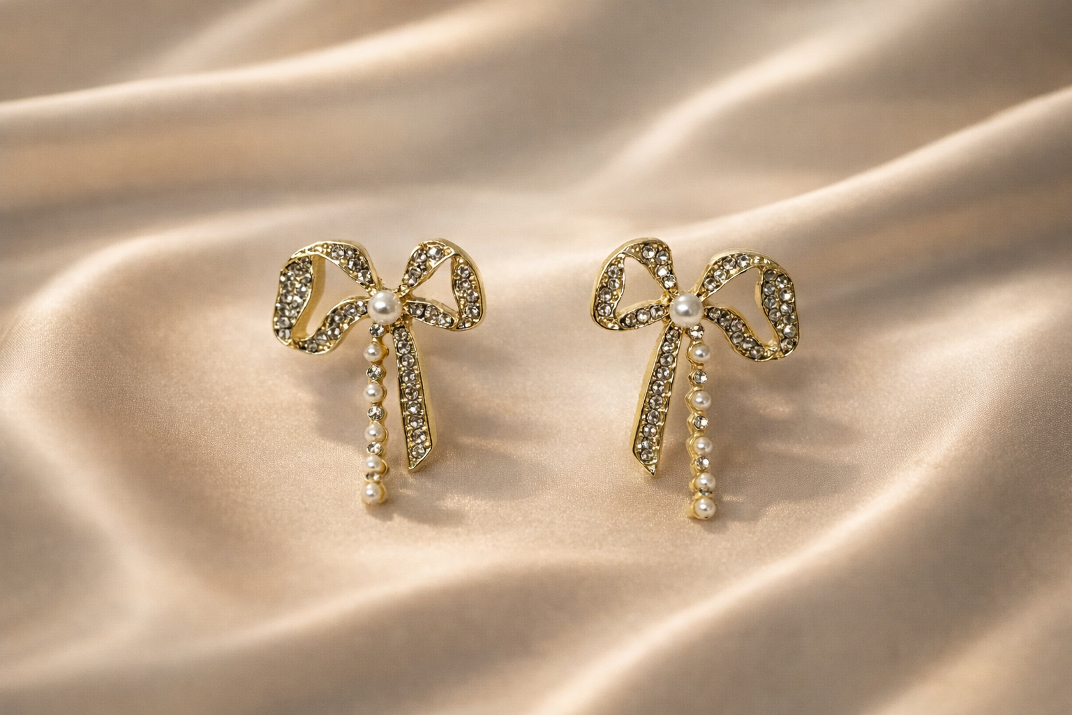 Designed in a delicate bow shape with sparkling stones and pearl drop detailing, these earrings beautifully blend Korean-inspired cuteness with modern luxury.