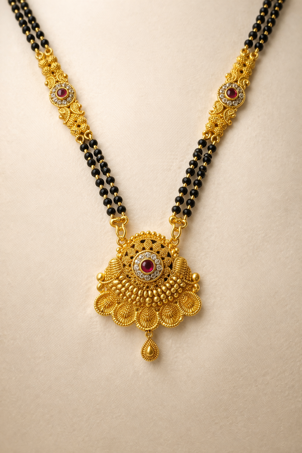 The necklace features dual black bead chains on both sides, symbolizing tradition, enhanced with intricately carved gold elements and rich ruby-toned stones that add a royal touch. The centerpiece pendant is adorned with fine detailing, textured patterns, and a radiant central stone surrounded by subtle sparkle, giving it a luxurious and majestic appeal.