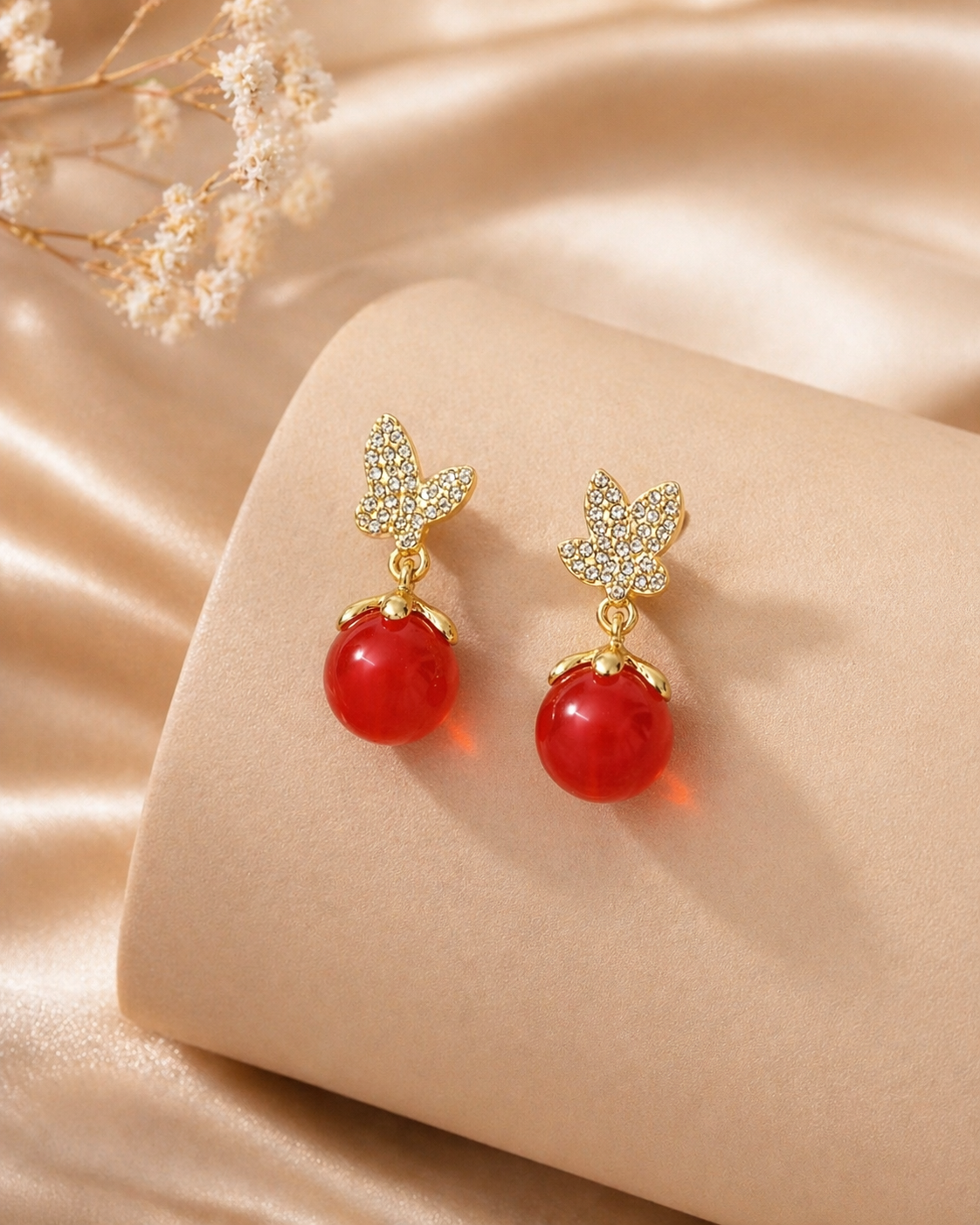 Elegant butterfly earrings with bold red drops — perfect for a festive and stylish look